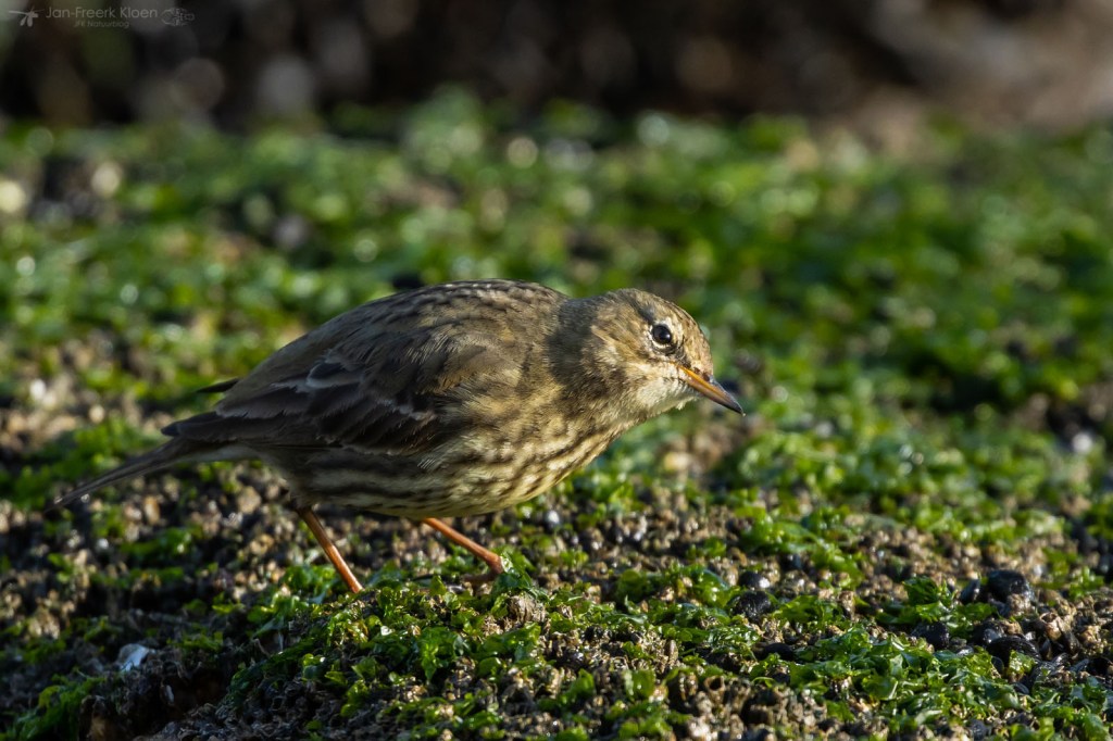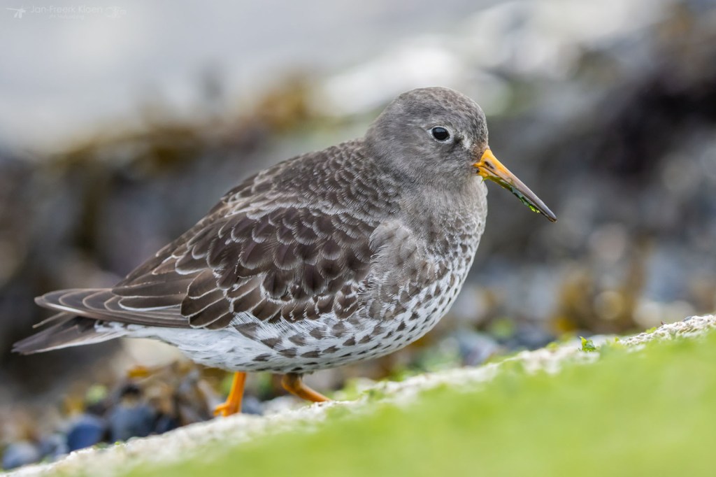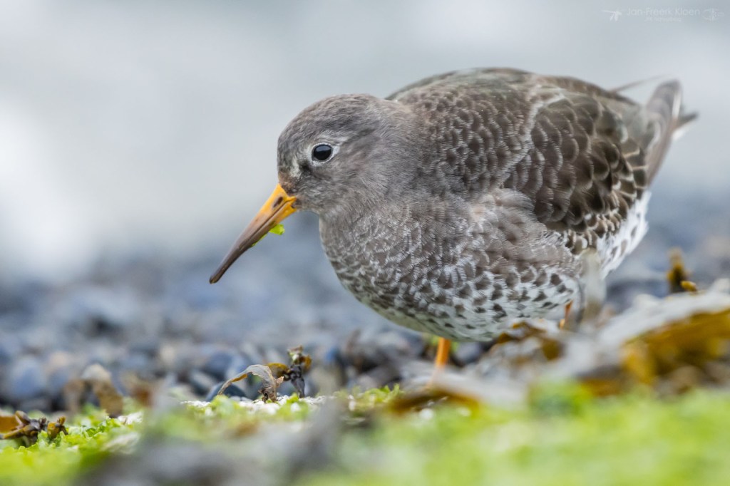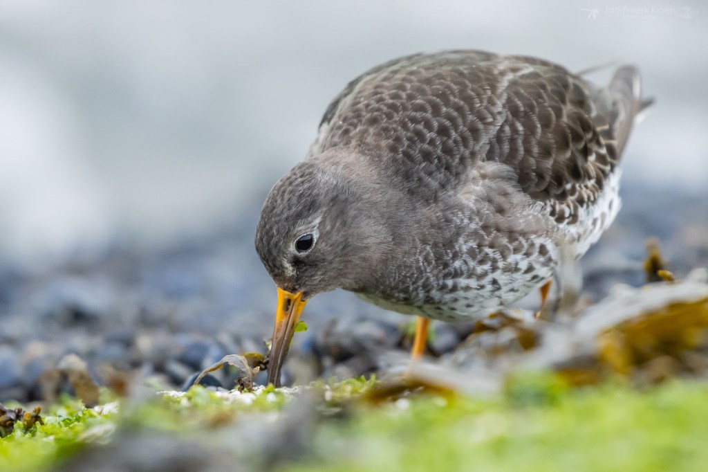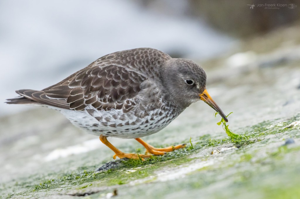 Ons bezoek aan de noordpier leverde vooral mooie foto’s van de paarse strandloper op. Deze wintergast foerageert vaak op rotsachtige plekken. In het geval van Nederland: pieren en dijken. De vogels bij IJmuiden zijn wel wat bezoek gewend. Toen ik een stukje naar beneden klom over de blokken voor een lager standpunt voor een foto van de kuifduiker (overigens een nieuwe soort voor mij) zag ik net wat laat dat er een paarse strandloper voor mijn neus zat. Maar in tegenstelling tot mijn verwachting vloog hij niet weg maar negeerde hij me volkomen. Sterker nog, ik bleef stil zitten en hij kwam bijna mijn lens in lopen. Zo mooi had ik dit donkere strandlopertje met zijn felgekleurde poten en snavel nog nooit gezien!