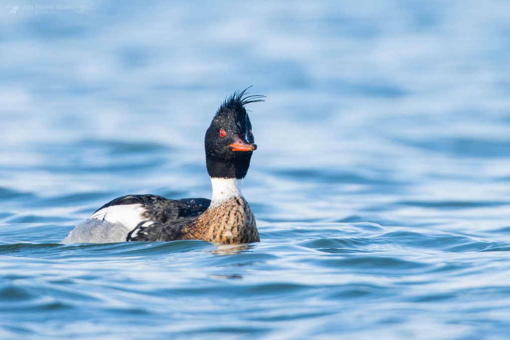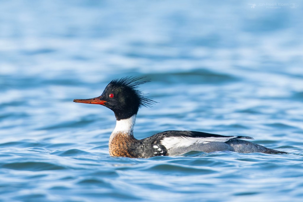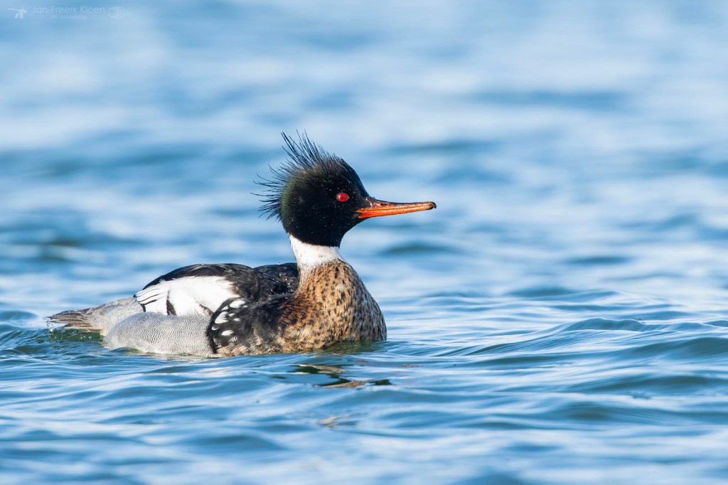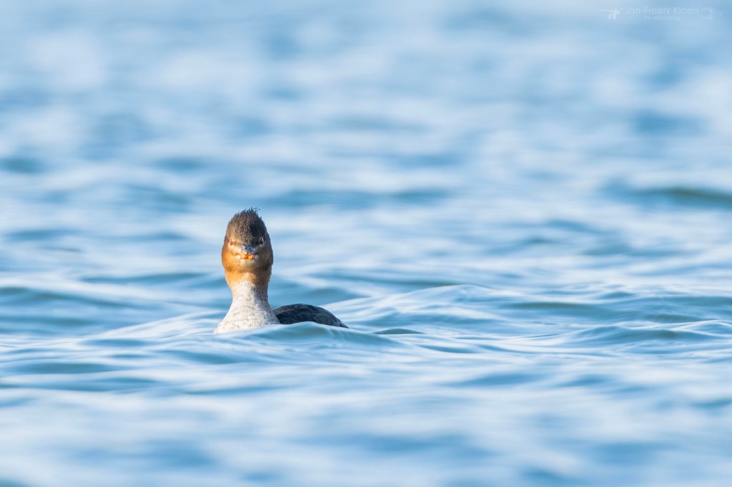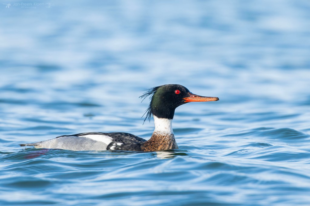 Aan het begin van de pier werd mijn aandacht getrokken door een middelste zaagbek die al duikend mooi te zien was. Omdat hij steeds verder naar een uitsteeksel van de pier afdreef besloot ik daarheen te gaan om hem op te wachten. En inderdaad: al duikend kwam hij steeds dichterbij tot ik deze maffe eend met zijn charmante kuif op amper 15 meter afstand had. Daar liet hij zich prachtig bekijken.