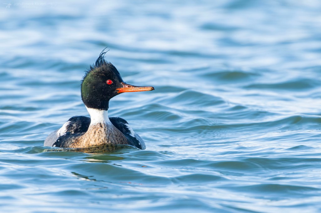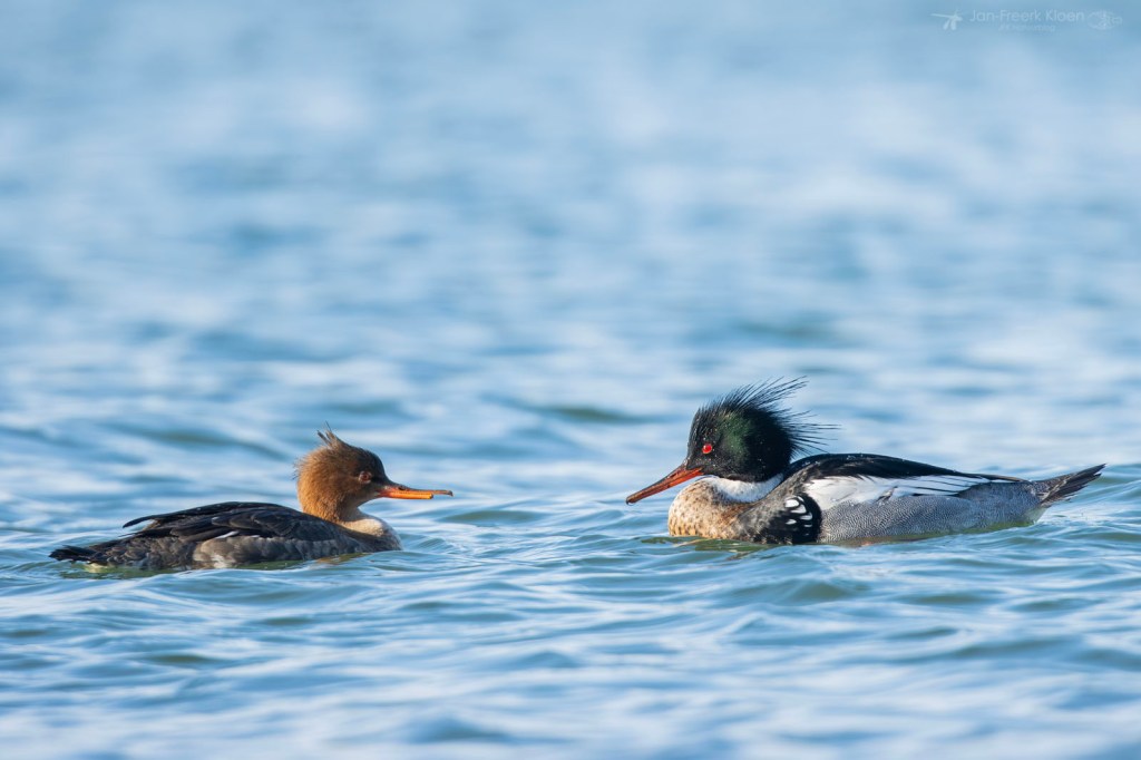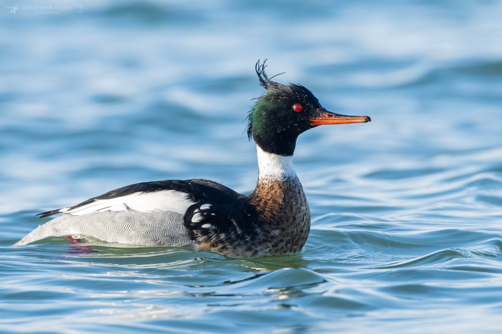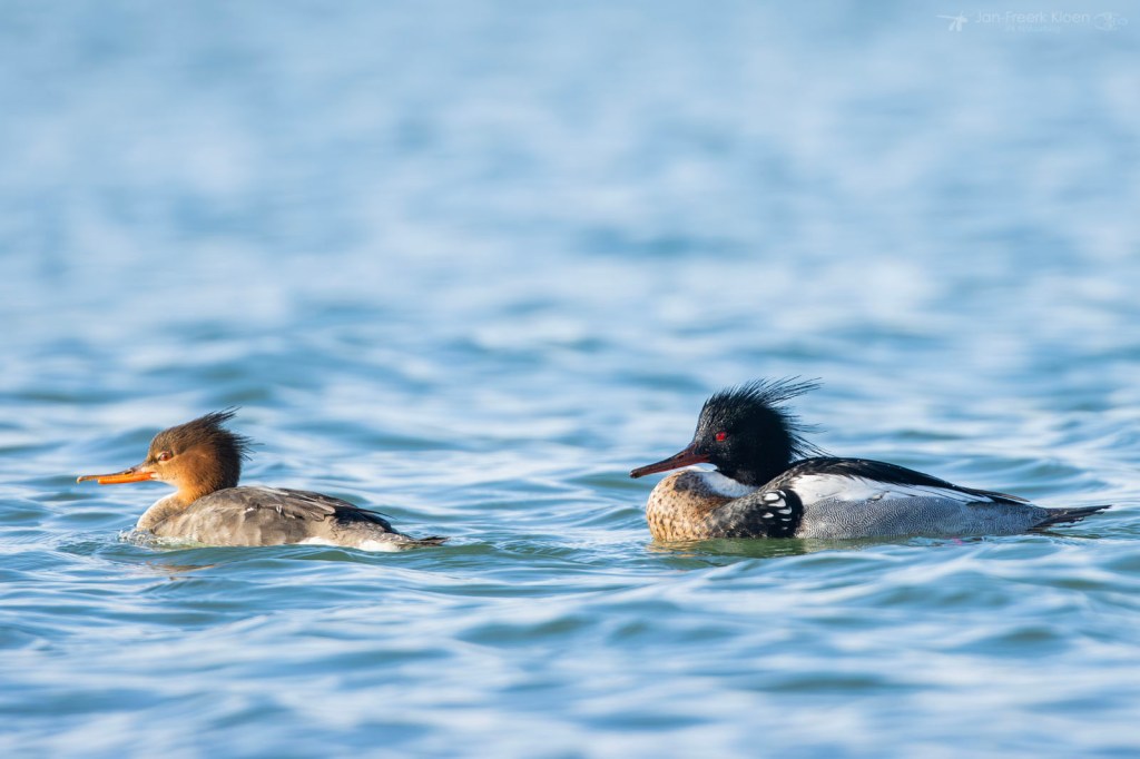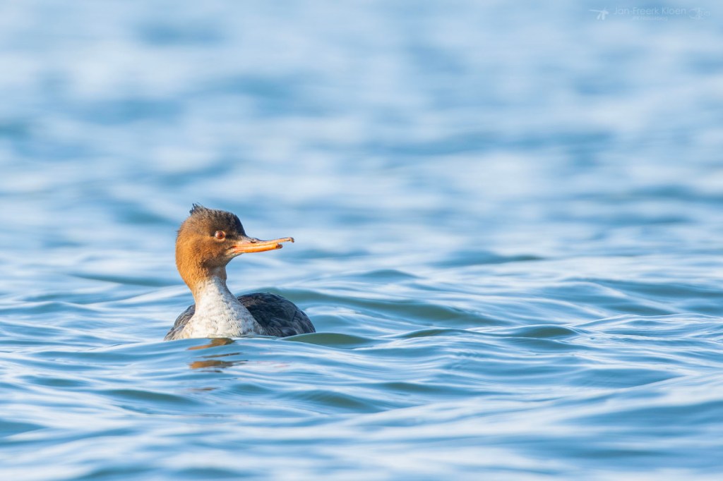 Aan het begin van de pier werd mijn aandacht getrokken door een middelste zaagbek die al duikend mooi te zien was. Omdat hij steeds verder naar een uitsteeksel van de pier afdreef besloot ik daarheen te gaan om hem op te wachten. En inderdaad: al duikend kwam hij steeds dichterbij tot ik deze maffe eend met zijn charmante kuif op amper 15 meter afstand had. Daar liet hij zich prachtig bekijken.