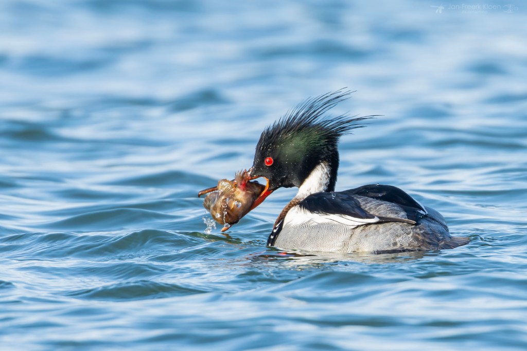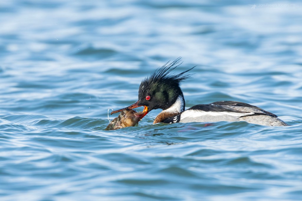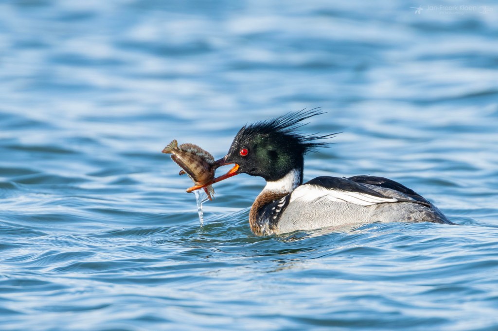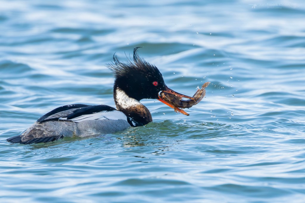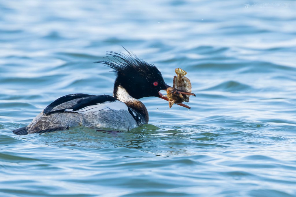 Na een duik waren zijn lange haren even plat, om na een keer met kop schudden weer overeind te komen. Eén keer kwam hij ook met een voor hem flinke vangst naar boven: een gehoornde slijmvis! Klemvast in de gezaagde snavel. Om hem weg te krijgen was nog wel een klusje, dat duurde even.