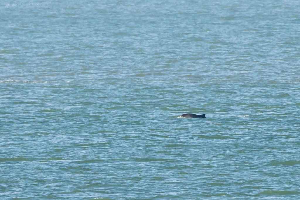 Begin van de middag liet een groep bruinvissen zich goed zien vanaf de pier. De afstand was weliswaar groot, maar ze waren wel goed zichtbaar met de verrekijker. Ik had al eens eerder een enkele bruinvis gezien. Die was erg moeilijk te volgen doordat die steeds lang onder water bleef en dan slechts één keer heel kort boven kwam om te ademen. Het voordeel van deze groep was dat ze meestal om de beurt boven kwamen, dus als de eerste was geweest wist je daarna waar je moest zijn om de volgende op de foto te krijgen. Dat werkte best goed.
