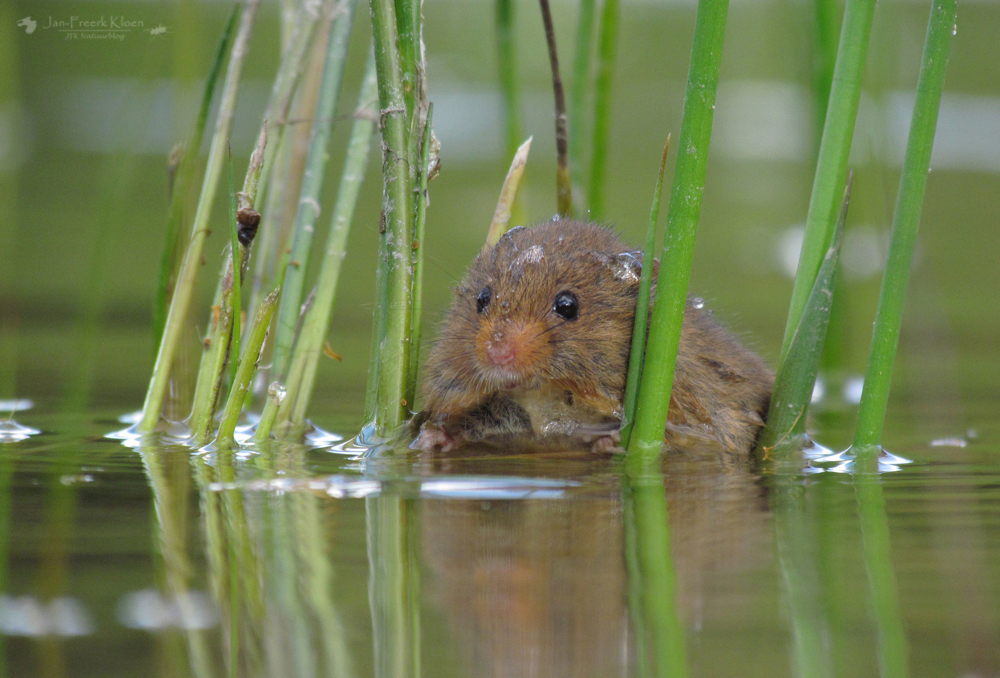 Ik heb de foto gemaakt bij Sarah in Ravenswoud, in juli dit jaar. Tijdens het avondeten sprongen Sarah en haar vader ineens op, omdat er een beest door de zwemvijver zwom. Ik zag nog niks, maar Sarah rende erheen en vertelde ons dat het een muis was. Het bleek een dwergmuis te zijn; die had ik ook nog nooit gezien, dus een fotosessie volgde!