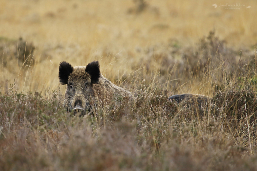 Op ongeveer twintig meter voor ons schoten vier volwassen dieren plotseling uit de hei omhoog en renden naar achteren, waarna we een stuk of tien biggetjes door de hei zagen rennen. Die konden de ouders niet bijhouden waarop de volwassen zwijnen na twintig meter bleven staan. Om de jongen te beschermen kwamen ze daarna in stevig wandeltempo terug lopen…